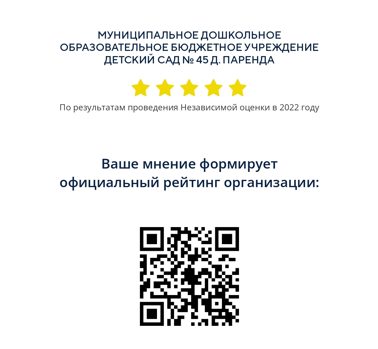 Вы можете оставить мнение о дошкольной организации на Официальном сайте для размещения информации о государственных (муниципальных) учреждениях (ГМУ, https://bus.gov.ru), чтобы оценить условия осуществления образовательной деятельности.